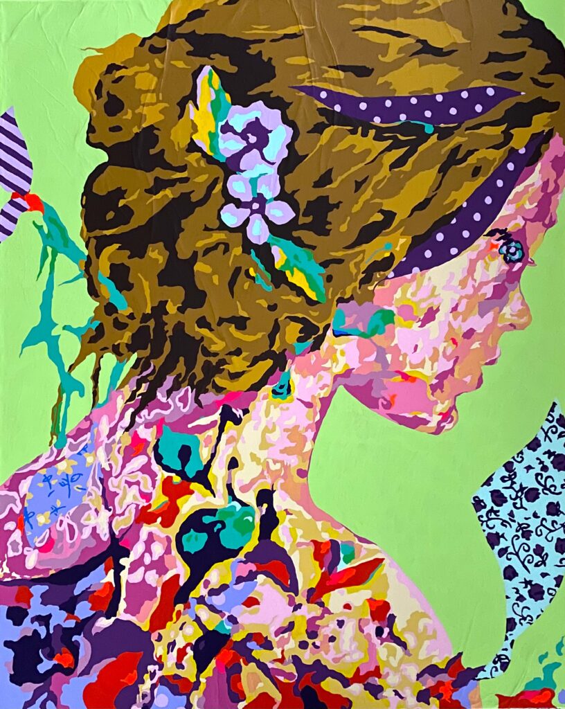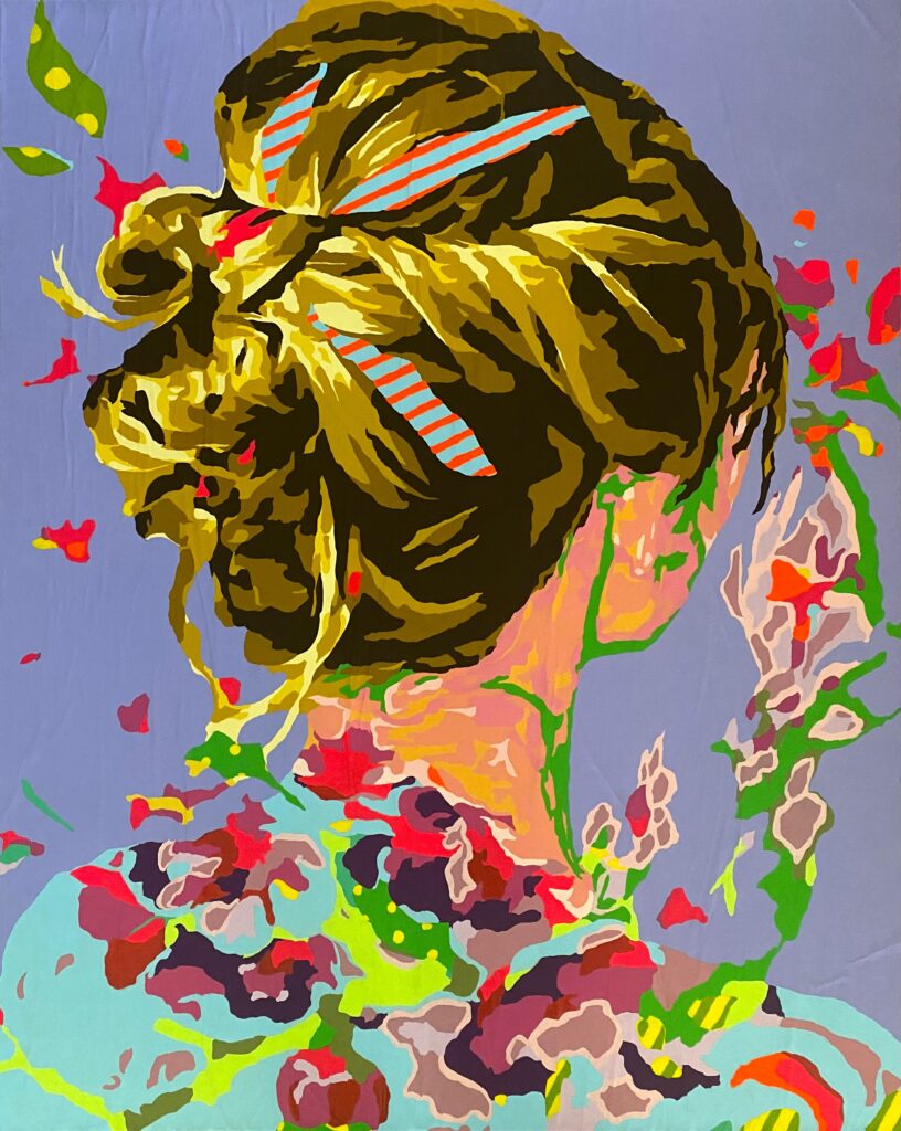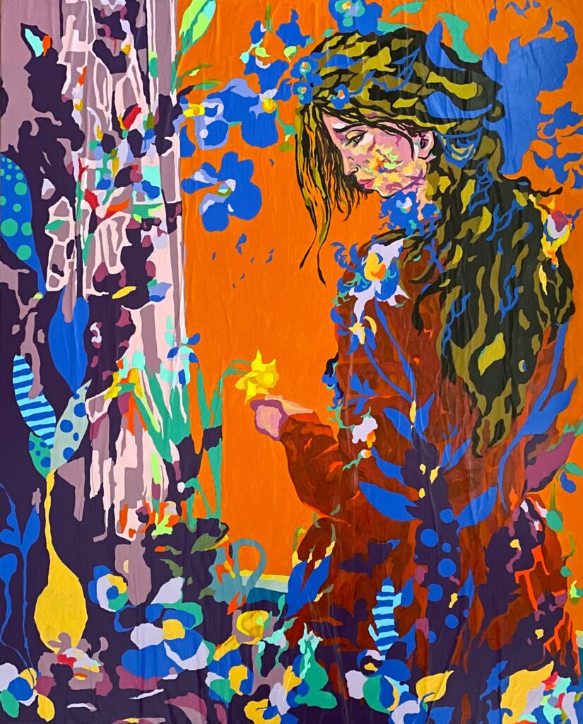 Les figures féminines se tiennent à la lisière du visible, absorbées dans un environnement végétal où la couleur domine. Entre portrait et paysage, la peinture explore la notion de présence — non pas celle du modèle, mais celle du regard et de la narration picturale.